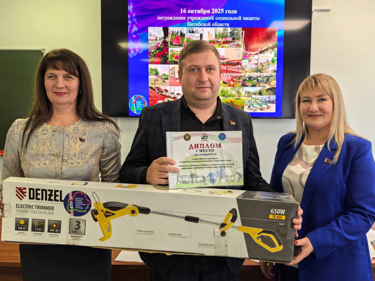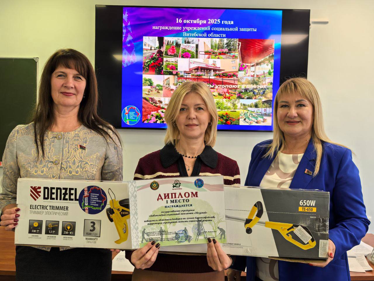 И все-таки члены жюри решили отдать первое место в конкурсе трем учреждениям: это ТЦСОН Первомайского района Витебска, Селютский социальный пансионат «Территория добра» и Бабиничский социальный пансионат «Звездный». Победителям вручили дипломы и ценные подарки – электрические триммеры.