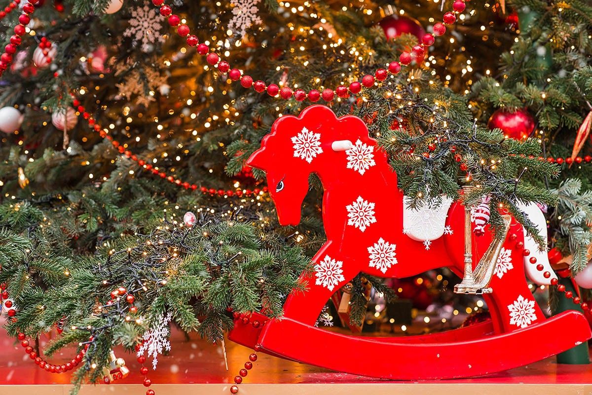 Чтобы создать в гостиной или столовой по-настоящему теплую атмосферу, начните с ёлки. Лучше всего для ее украшения подойдут игрушки из природных материалов — деревянные фигурки, мягкие помпоны из шерсти или украшения из плотной бумаги. Идеальная цветовая гамма — сочное сочетание зеленой хвои, красных и золотых шаров. И не забудьте про главный символ — добавьте в украшения пару изящных лошадок.