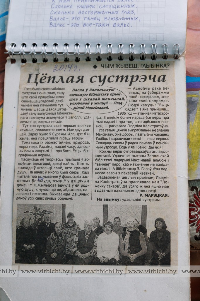 Стихи она стала сочинять в подростковом возрасте. Призналась, когда их пишет, будто голос свыше диктует строки и подбирает рифмы. Она прочитала нам стихи о родной деревушке, которая обезлюдела после чернобыльской катастрофы, о матери, об Отчизне...